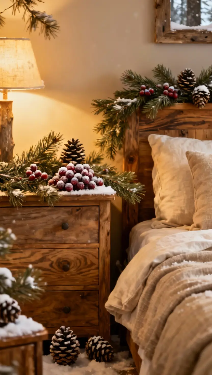 Arrange natural pine boughs, some bright frosted cranberries, and snow-dusted pinecones casually on your dresser and nightstands.
