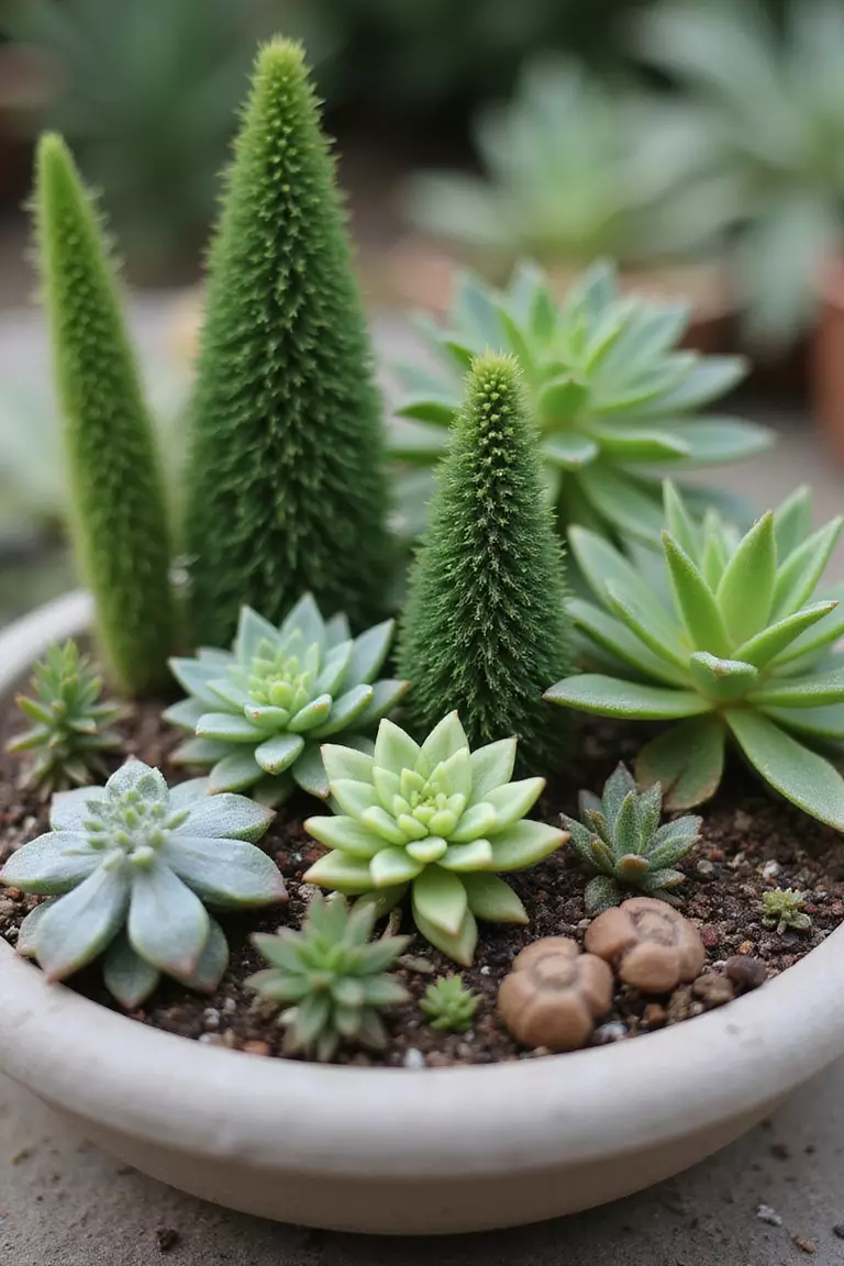 Choose small, slow-growing plants that look like tiny trees or bushes.