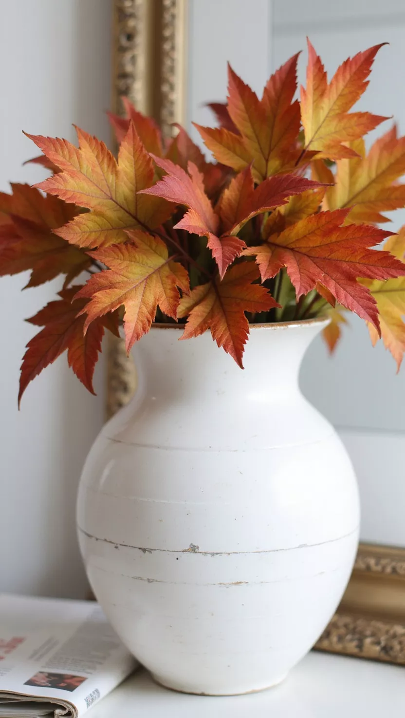Finding a beautiful white vase, maybe one with a little character from a antique shop, and then filling it with auburn and gold leaves?