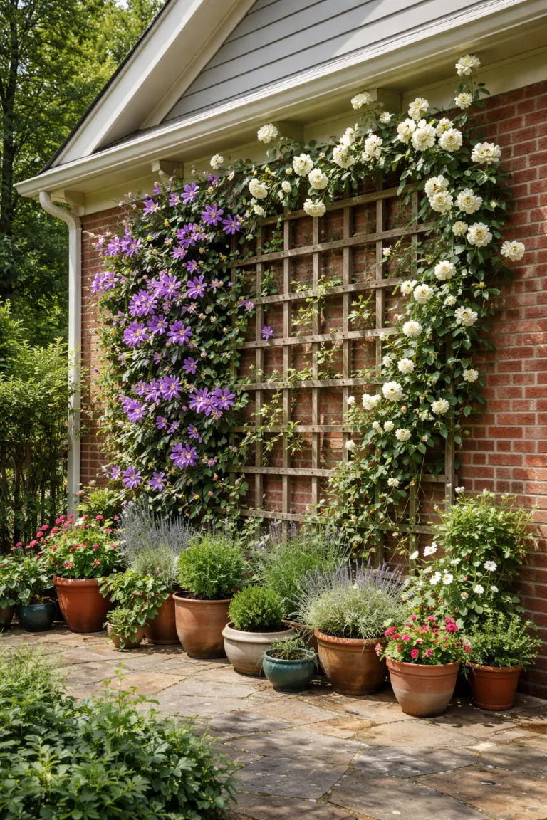 Install a trellis or wall pockets to host climbing roses and clematis.