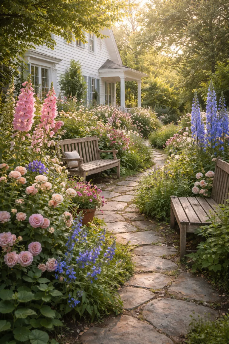 You can capture that romantic, untamed feeling by packing your beds with foxgloves, delphiniums, and roses.