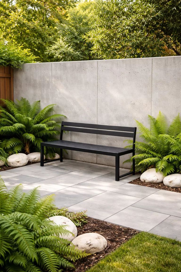 You can pair a dark metal bench with lush, oversized greenery to create a sharp contrast that looks expensive.
