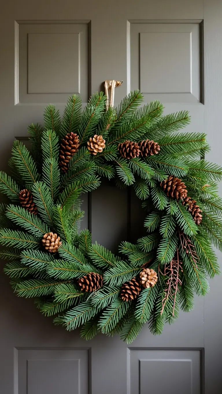 Instead of mixing in greenery, you construct one dramatic, large wreath using only various types and sizes of overlapping pinecones.