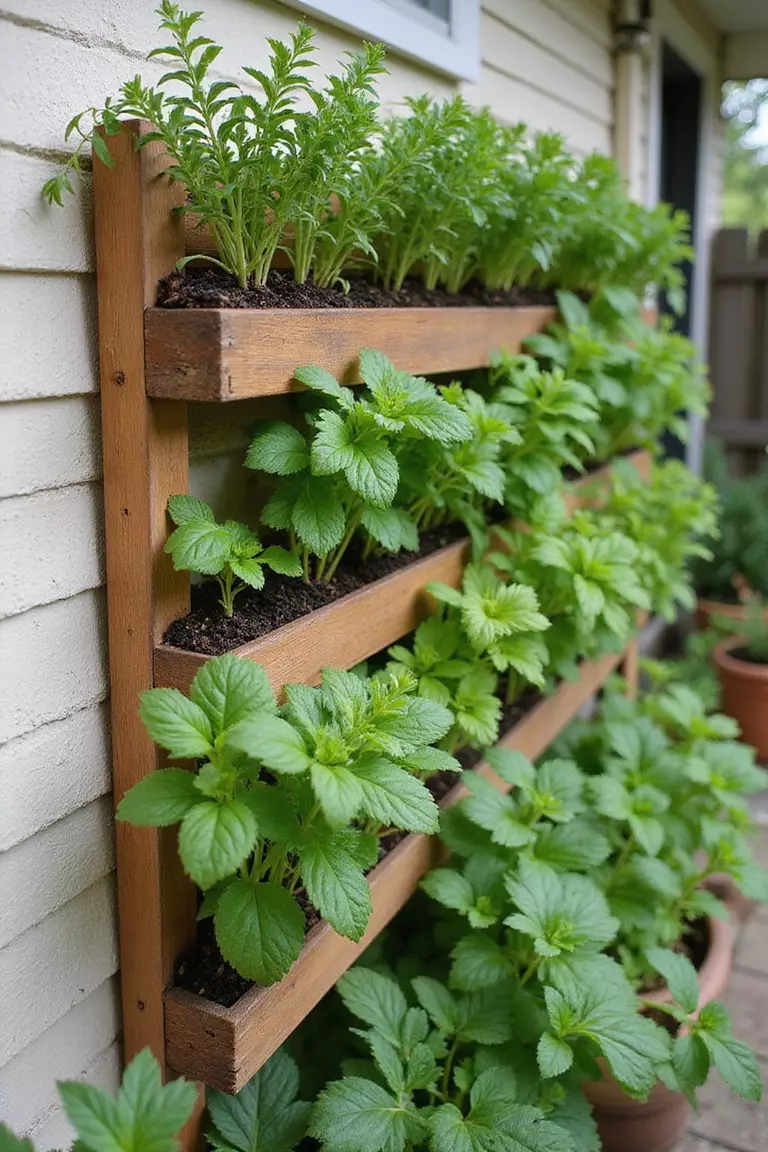 Mount a wooden planter on your patio wall and fill it with basil, mint, rosemary, and thyme.