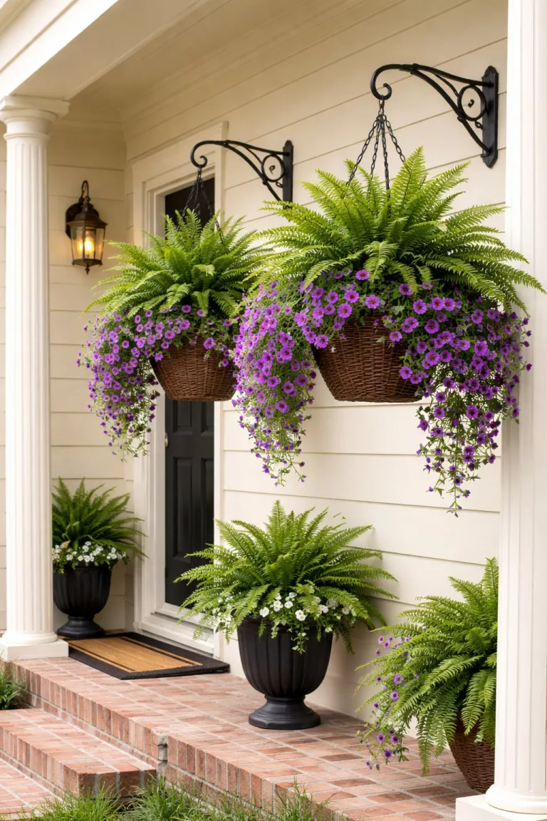 Hanging baskets filled with lush ferns or colorful trailing petunias add layers of life without creating a tripping hazard.